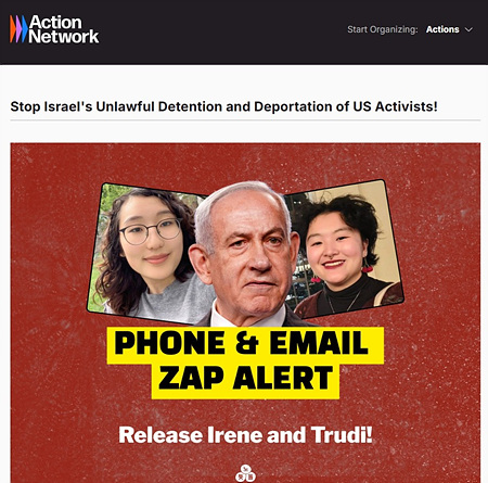 À̽º¶ó¿¤ Á¤ºÎ ´ç±¹ÀÌ ÆÈ·¹½ºÅ¸ÀÎ ¼¾ÈÁö±¸¿¡¼ ÆòÈ È°µ¿À» ¹úÀÌ´ø ¹Ì±¹ ½Ã¹Î±ÇÀÚÀÎ ÇÑÀÎ 2¼¼ ¾ÆÀ̸° Á¶(Irene Cho)¾¾¿Í Æ®·çµð ÇÁ·Î½ºÆ®(Trudi Frost)¾¾¸¦ ºÒ¹ý üÆ÷, ±¸±Ý(ϬÐ×)ÇÏ°í °Á¦ Ãß¹æ Á¶Ä¡¸¦ ÁøÇàÇϰí ÀÖ¾î ±¹Á¦ÀûÀÎ ºñ³ÀÌ Àϰí ÀÖ´Ù.